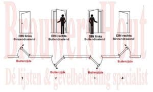 Bij een deur bestaan er twee draairichtingen: een linksdraaiende deur en een rechtsdraaiende deur. Dit hangt af van waar de scharnieren hangen. Door de deur naar je toe te trekken, is duidelijk te zien aan welke kant de scharnieren zitten. Het is dus niet ingewikkeld om te achterhalen wat de draairichting is, maar wel heel belangrijk:
