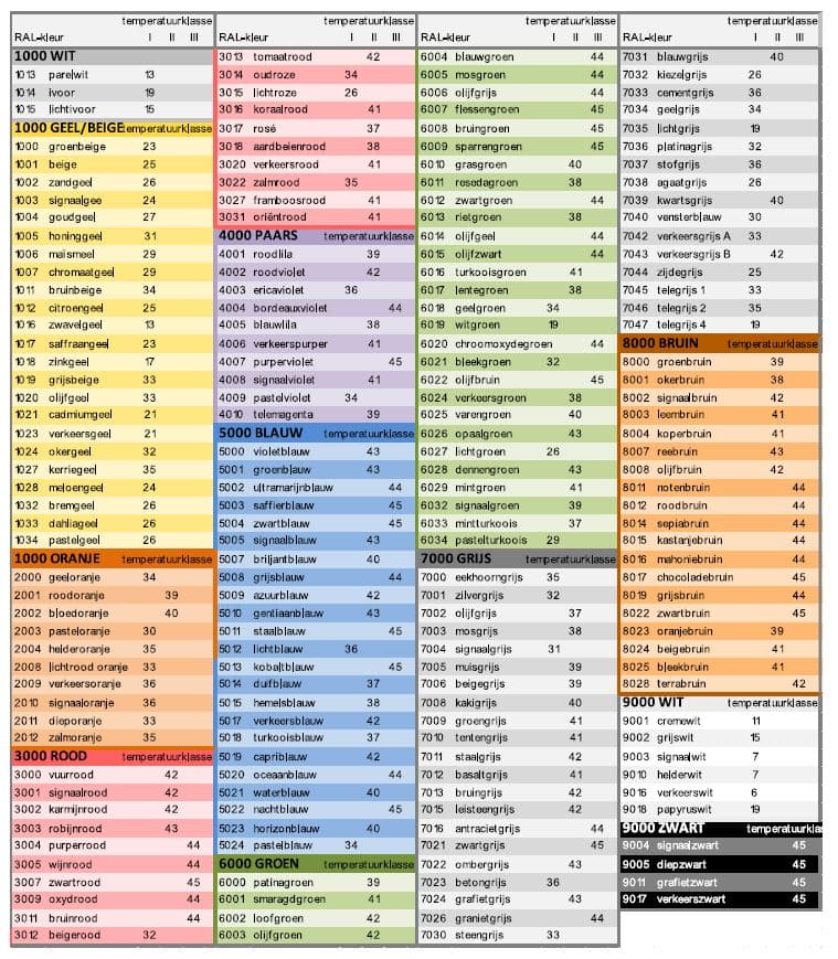 De meest ongunstige praktijksituatie is bij een zuid-/zuidwest gevel. In de zomer kan deze oppervlakte temperatuur dan ook behoorlijk stijgen. Niet RAL-kleuren kunnen bij de dichtstbijzijnde RAL-kleur gehouden worden om te kunnen achterhalen tot welke temperatuurklasse deze kleur valt. U kunt dit ook nauwkeurig berekenen via een rekenformule. De te verwachten maximum oppervlakte temperatuur kan via de helderheidswaarde van een kleur worden bepaald. De helderheidswaarde Y (volgens ISO-norm 7724-1) staat op nagenoeg elke kleurenwaaier vermeld. Is van een kleur de helderheidswaarde (Y) bekend, dan kan de temperatuurstijging in het oppervlak (Tos) worden berekend met behulp van de formule: Tos = 47,5 x (1-Y/100). Temperatuurklasse:
